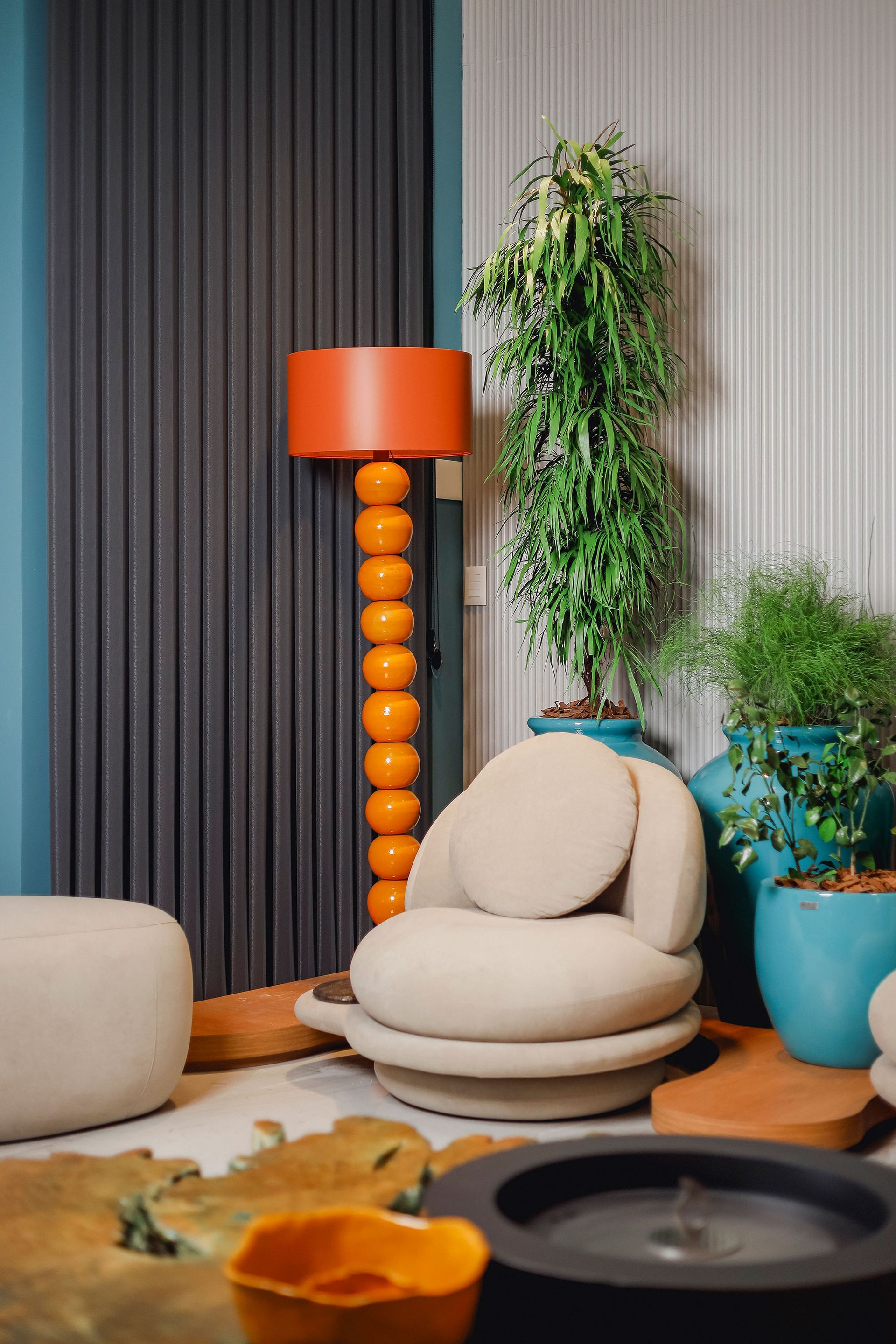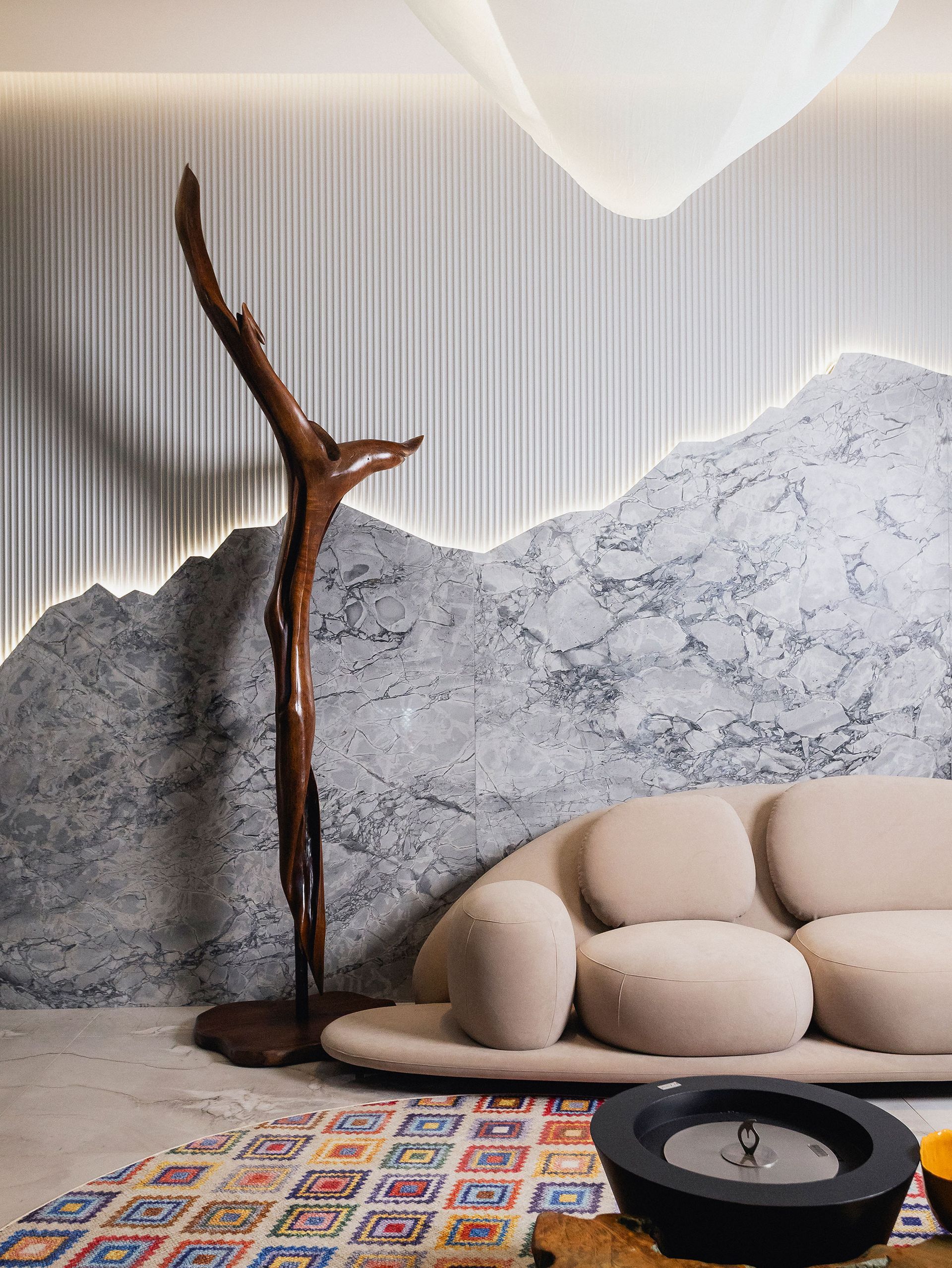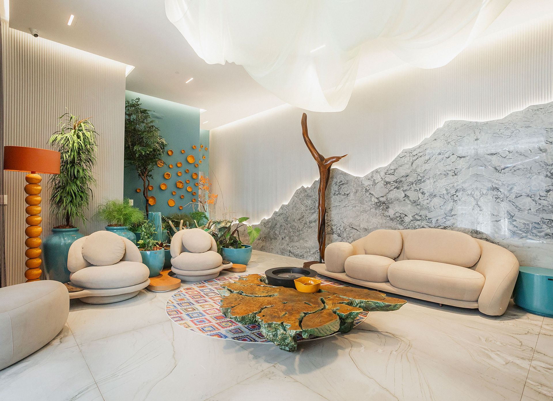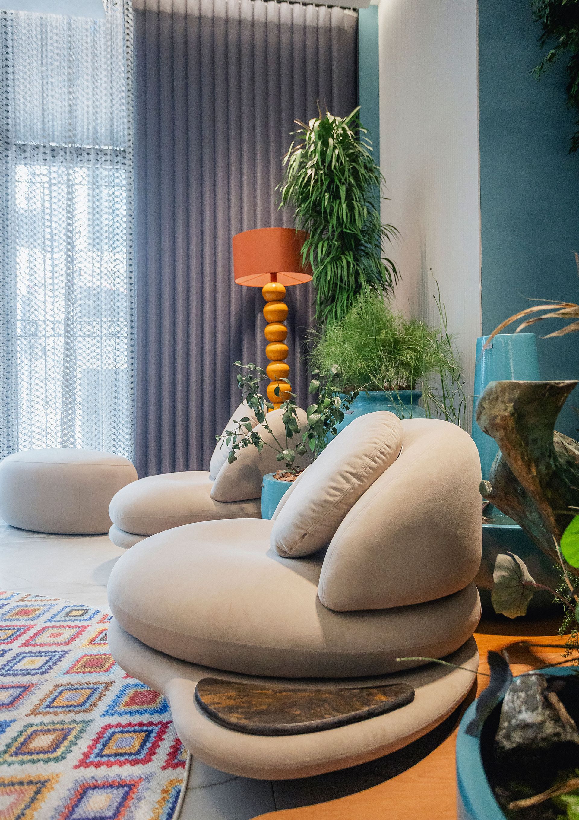Entre os destaques do mobiliário, estão os Monolitos e puffs da Bell'Arte, que evocam a ideia de pedras esculpidas pelo tempo, perfeitamente inseridos na narrativa do espaço. Já a Poltrona Gel rouba a cena com sua base de pedras multifuncional — que também serve como porta-copos — e o movimento giratório, que reforça a sensação de fluidez e leveza.