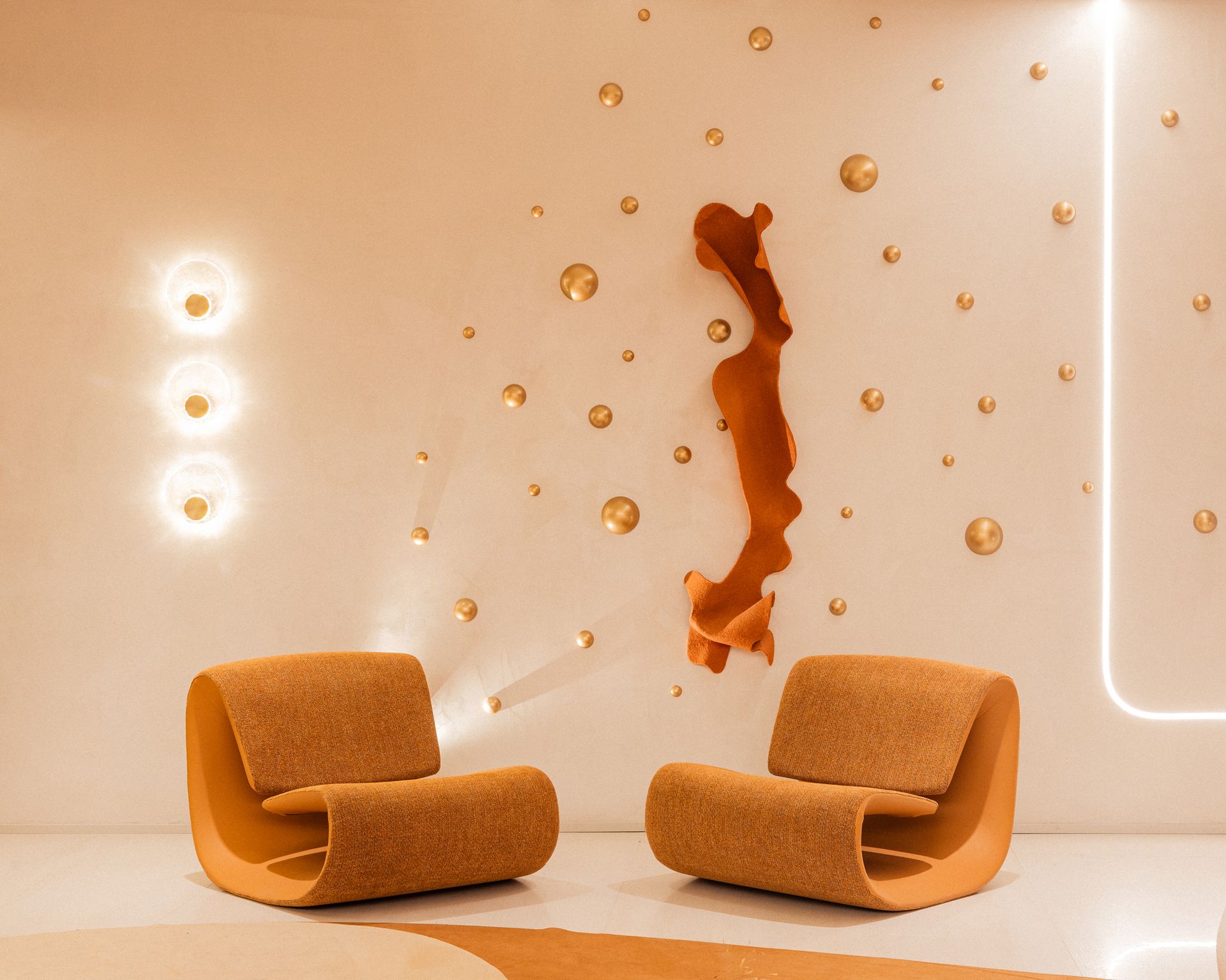 O living do espaço Onipresença é marcado por linhas fluidas e envolventes, criando um ambiente acolhedor e contemplativo. O sofá Zenith